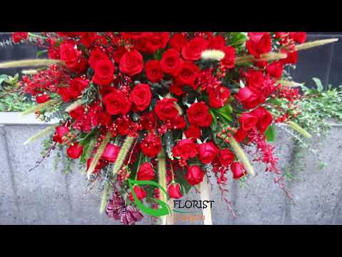 Stylish arrangement of red roses, red dendrobium arranged as a heart shape, perfect surprise on Valentines day. This Heart shaped red rose stand is special gift for wedding anniversary, new business...